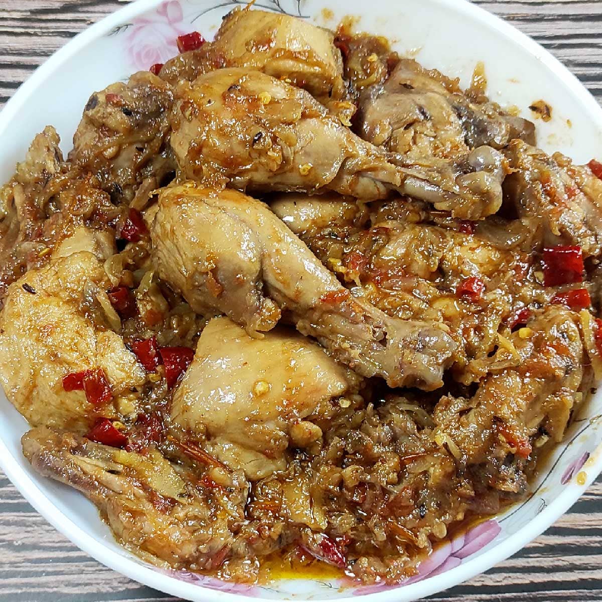 - Add 1 kg chicken. Chicken needs to be cut into regular size pieces, washed, and drained before adding.